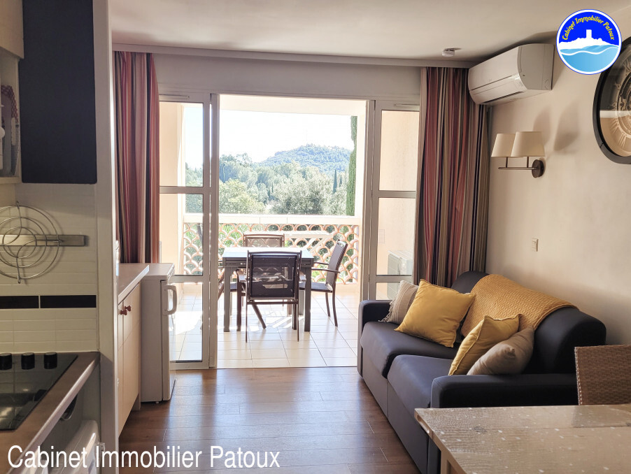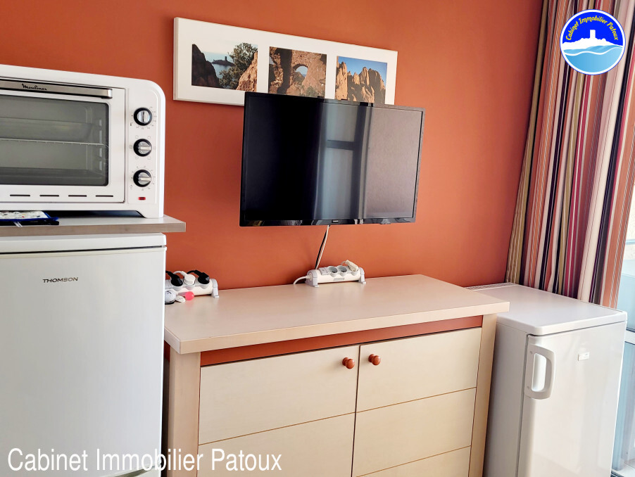 Salle de séjour climatisé avec un canapé lit neuf en 140 cm, une table avec 4 chaises, un meuble de rangement, une TV murale et un grand placard penderie.