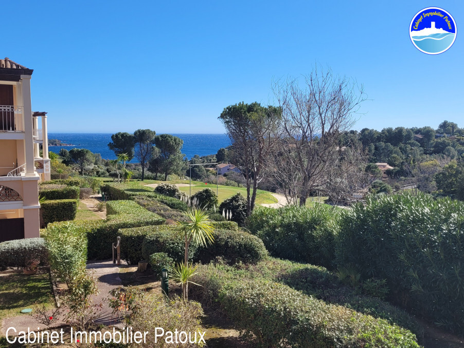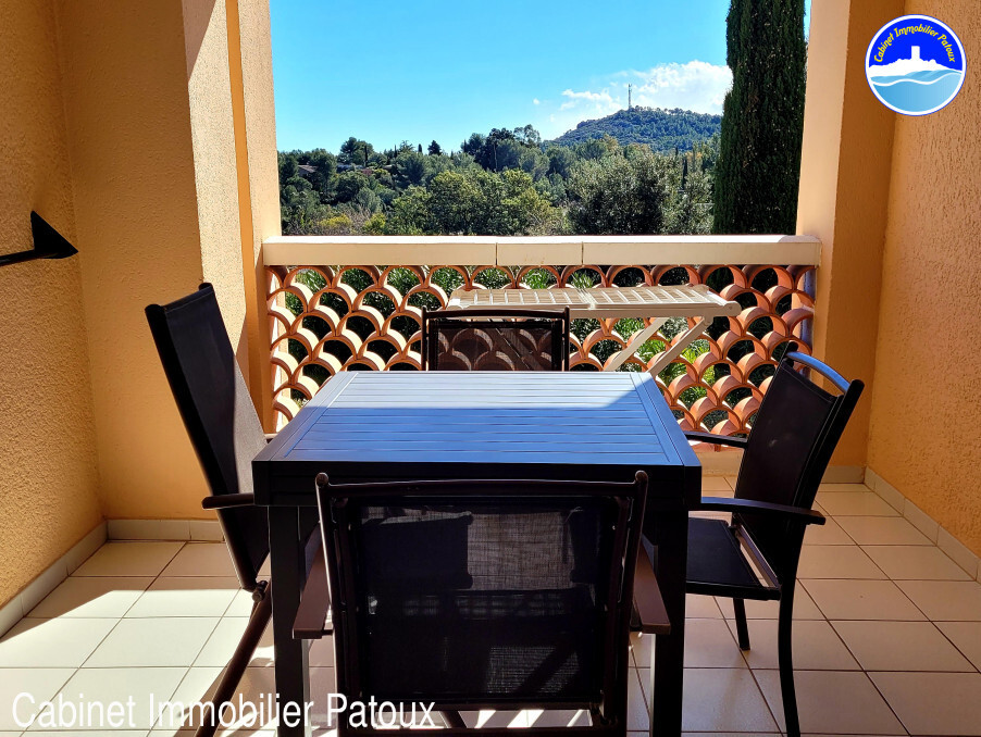 Grande terrasse couverte exposée sud avec vue mer et verdure sud, une table de jardin, 4 chaises et une plancha.