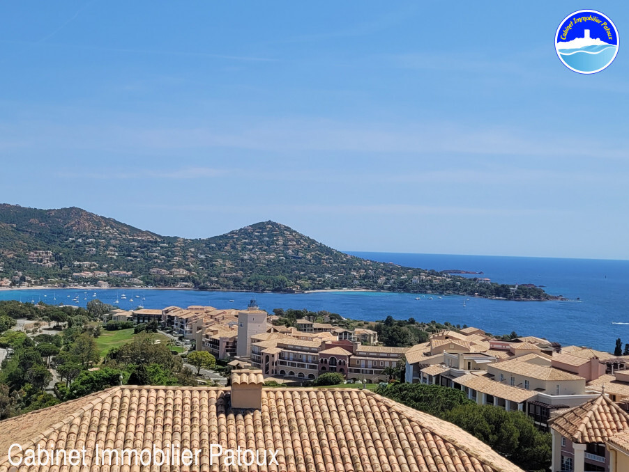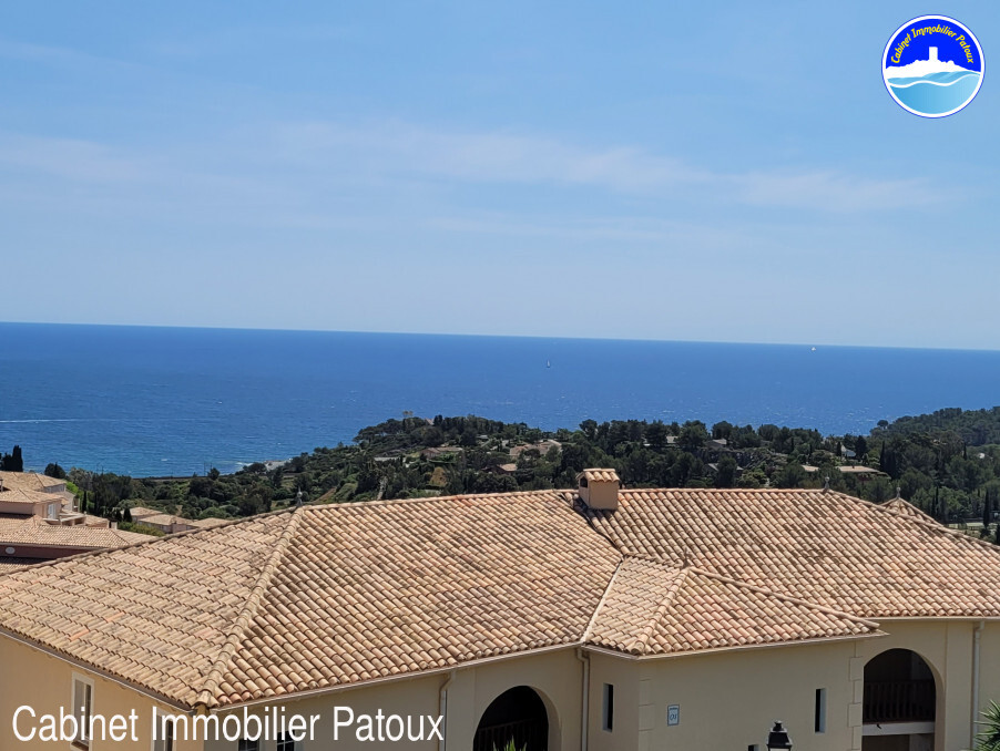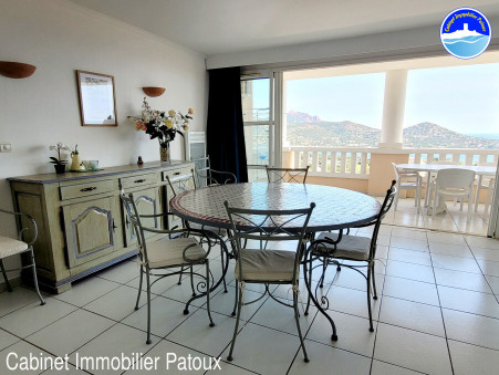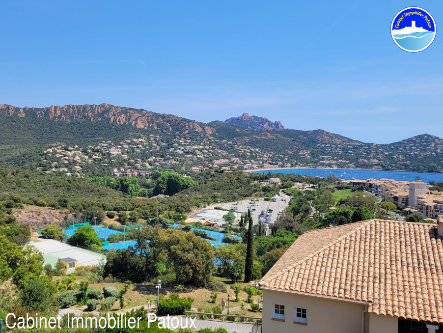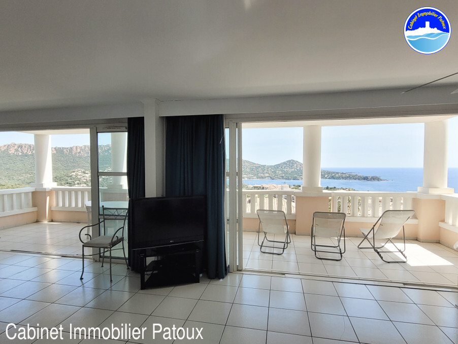 Grande terrasse de 11 m de long avec espace repas pour 7 personnes et coin détente avec 4 transats donnant sur la baie d'Agay et le massif de l'Estérel