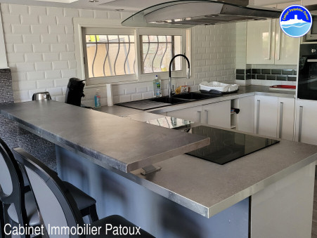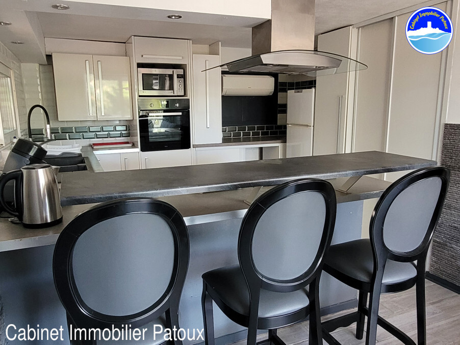 Salon avec canapé lit et cuisine américaine équipée d'un comptoir et 3 chaises hautes pour les repas, une plaque de cuisson 3 feux et hotte, un frigo congélateur, un four, un micro-ondes, un lave-linge, une cafetière Senseo, une bouilloire et un grille-pain