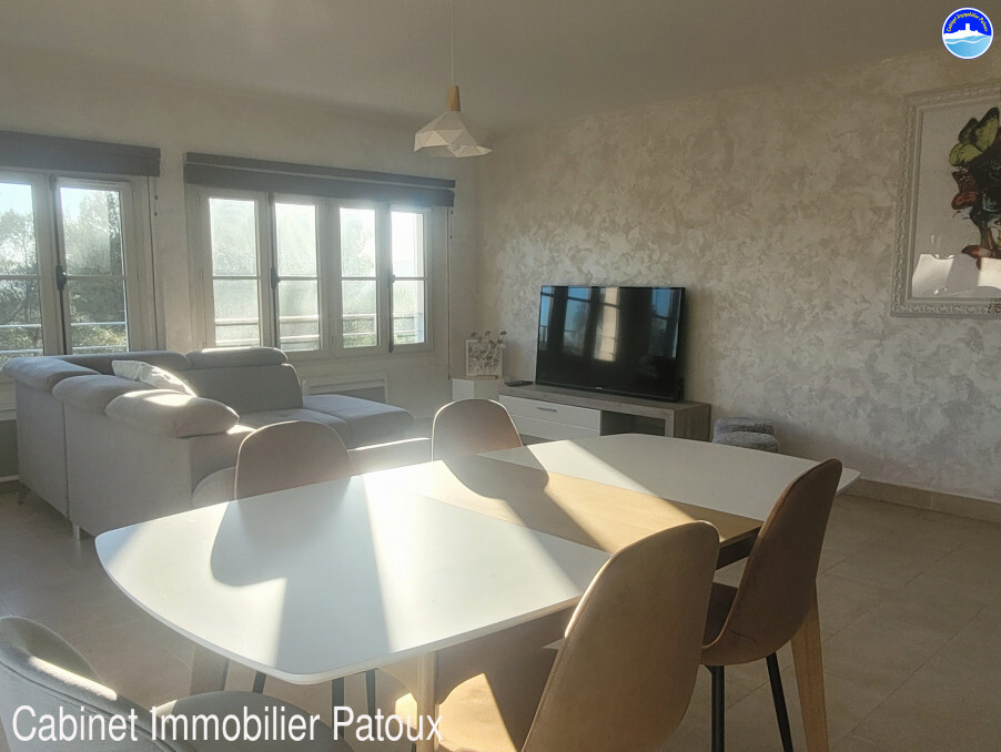 Grand séjour très lumineux avec des grandes fenêtres, coin salon avec grand canapé d'angle et espace salle à manger avec une grande table