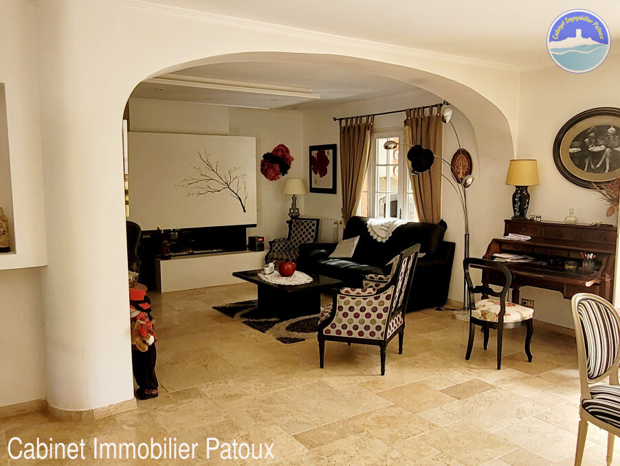 Très spacieuse salle de séjour donnant sur la terrasse avec espace salle à manger (fenêtre vitrail), et espace détente avec canapé, fauteuils et cheminée design