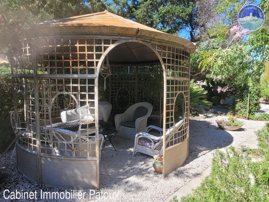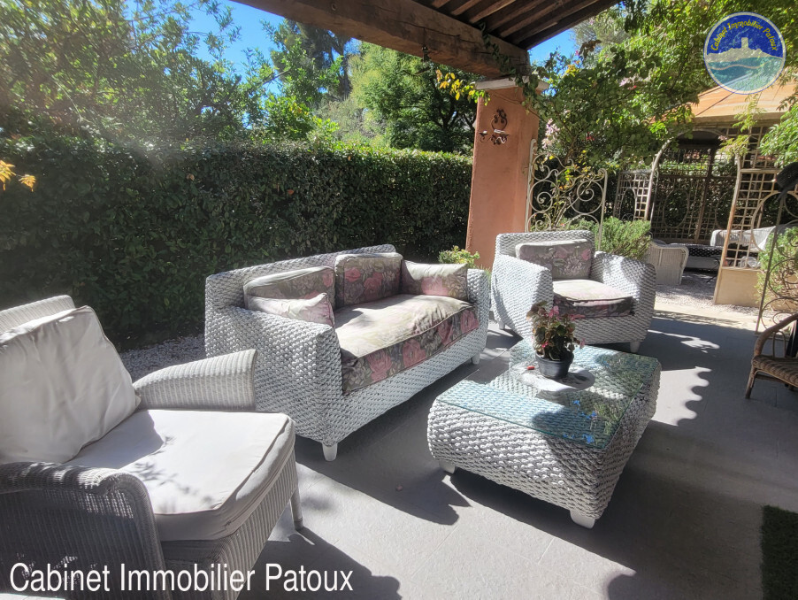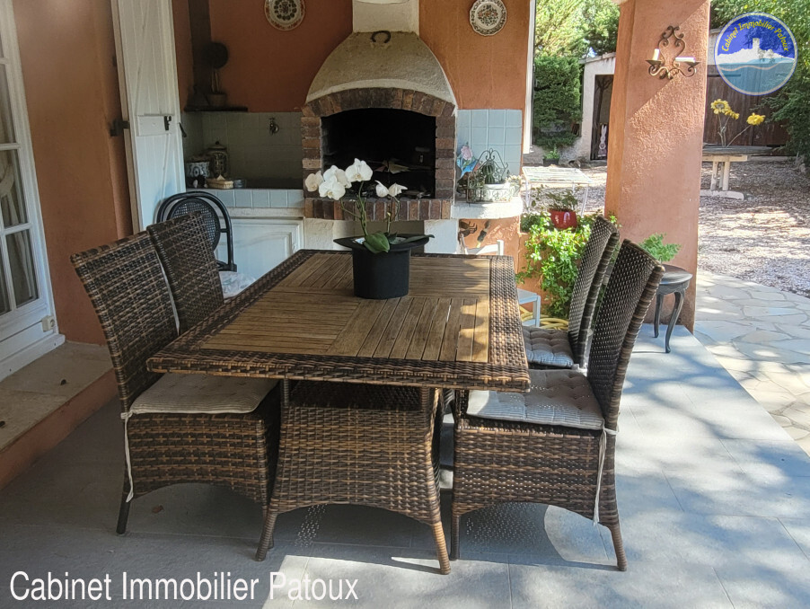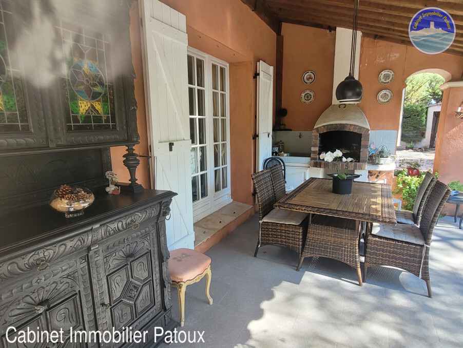 Grande terrasse couverte de 30 m² exposée sud avec coin salon et salle à manger d'été avec cheminée.